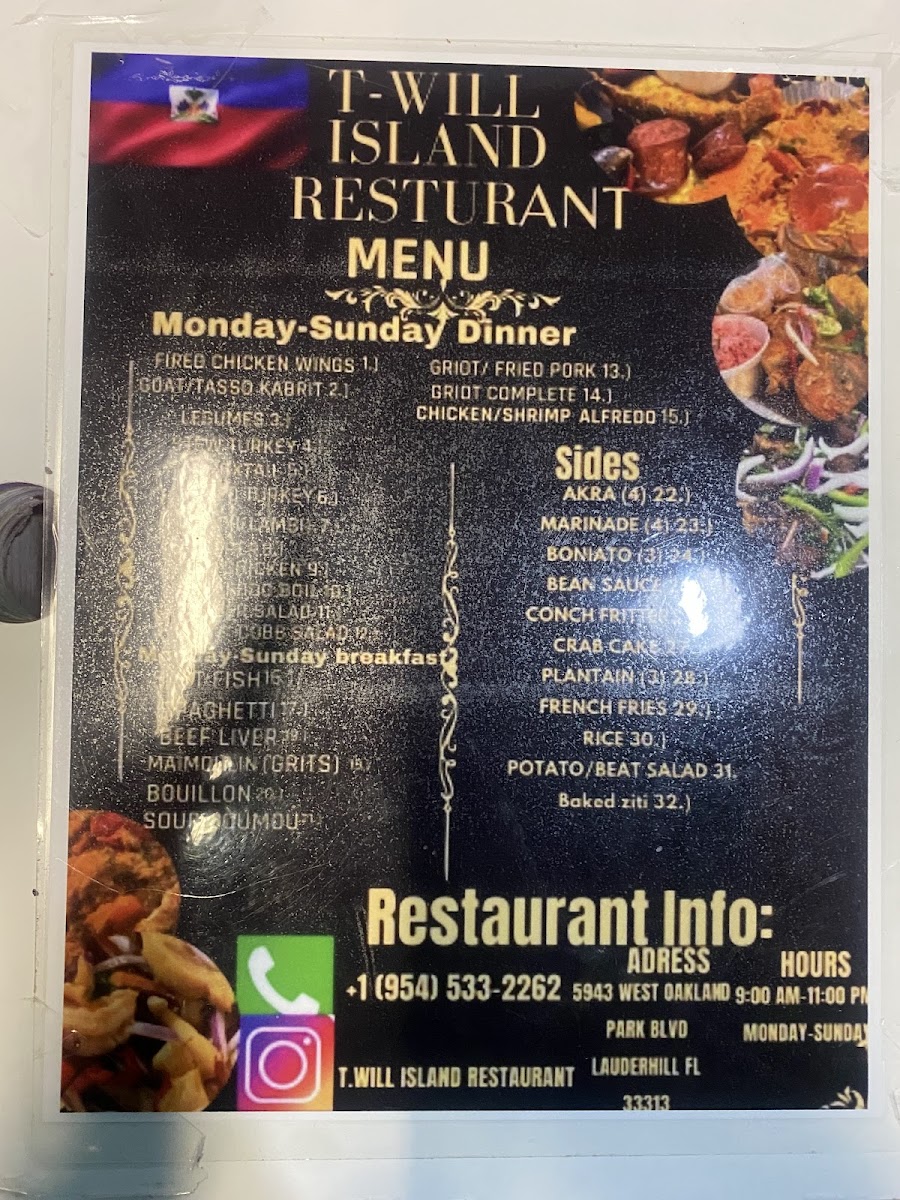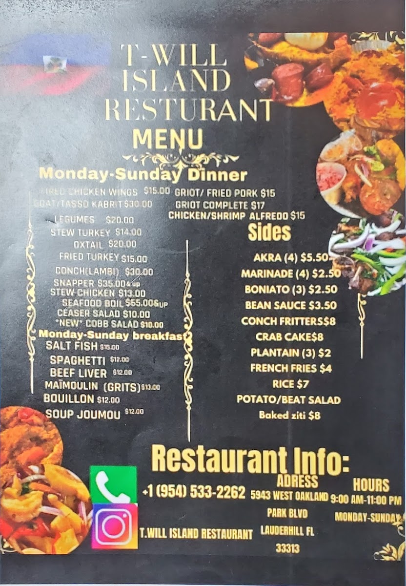 Overall, T-Will Island Restaurant provides a vibrant and flavorful menu that showcases a blend of Caribbean and island-inspired dishes. The variety ensures that there’s something for everyone, from savory mains to refreshing drinks and indulgent desserts. Whether you're visiting for a quick breakfast or enjoying a relaxing dinner, this restaurant offers a warm and inviting atmosphere, perfect for any occasion.